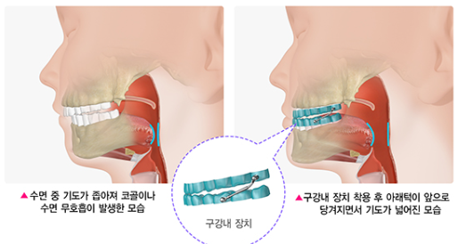 구강 내 장치는 턱을 앞으로 밀어 기도가 좁아지지 않도록 하는 기구입니다. 이 장치는 코골이를 완화시키고, 수면 중 기도가 차단되는 것을 방지하는 효과가 있습니다. 구강 내 장치는 특히 경미한 수면 무호흡증을 앓는 사람들에게 유용합니다.